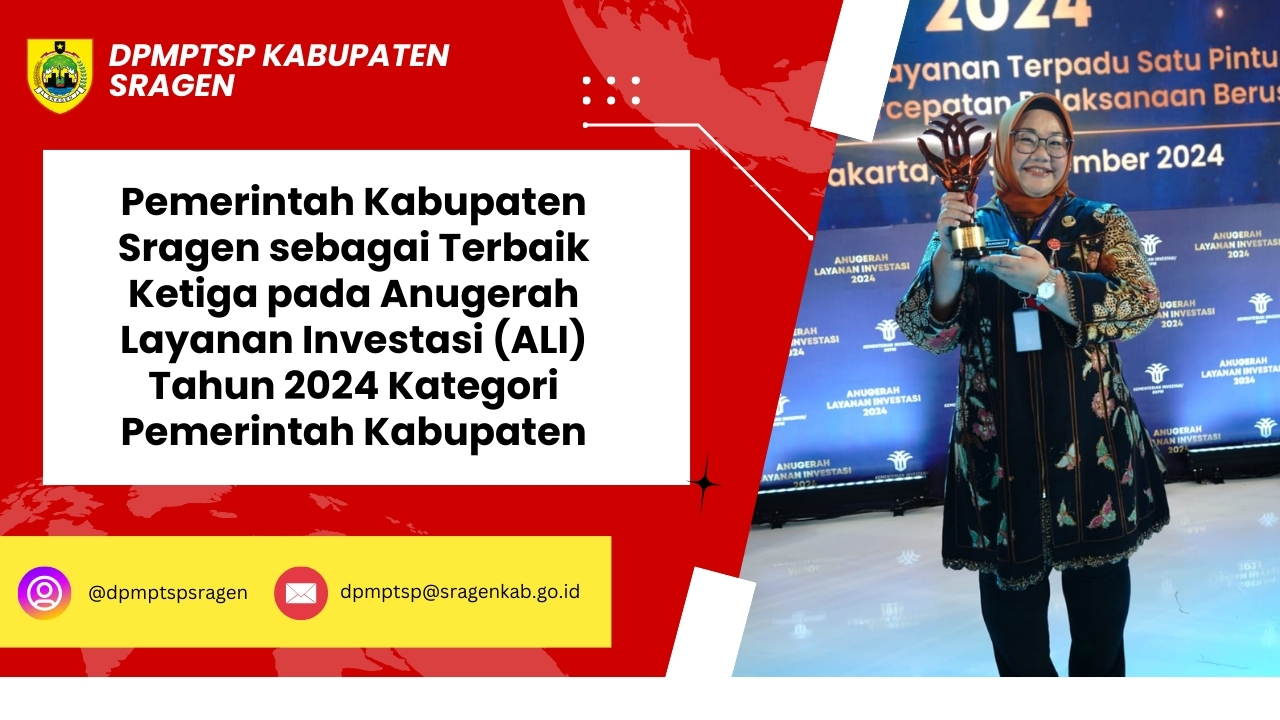 Pemerintah Kabupaten Sragen sebagai Terbaik Ketiga pada Anugerah Layanan Investasi (ALI) Tahun 2024 Kategori Pemerintah