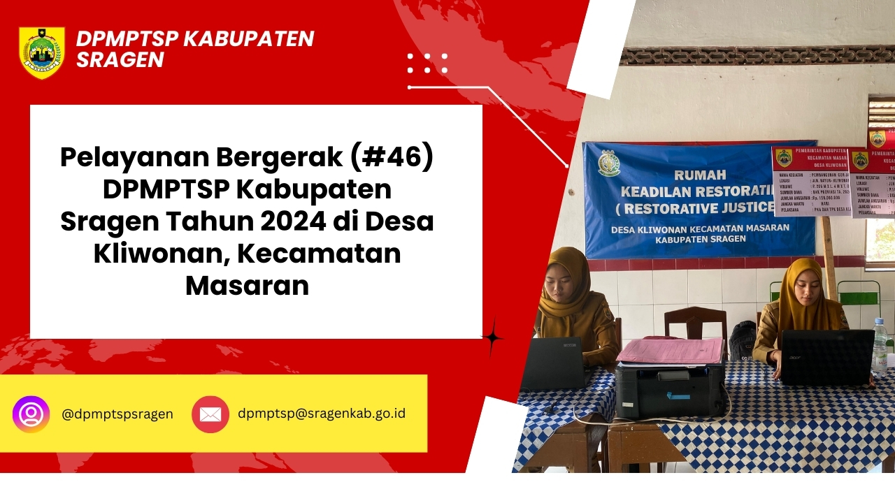 Pada Senin (26/8/2024) Pelayanan Bergerak DPMPTSP Kabupaten Sragen (#46) berada di wilayah Kecamatan Masaran, tepatnya d...