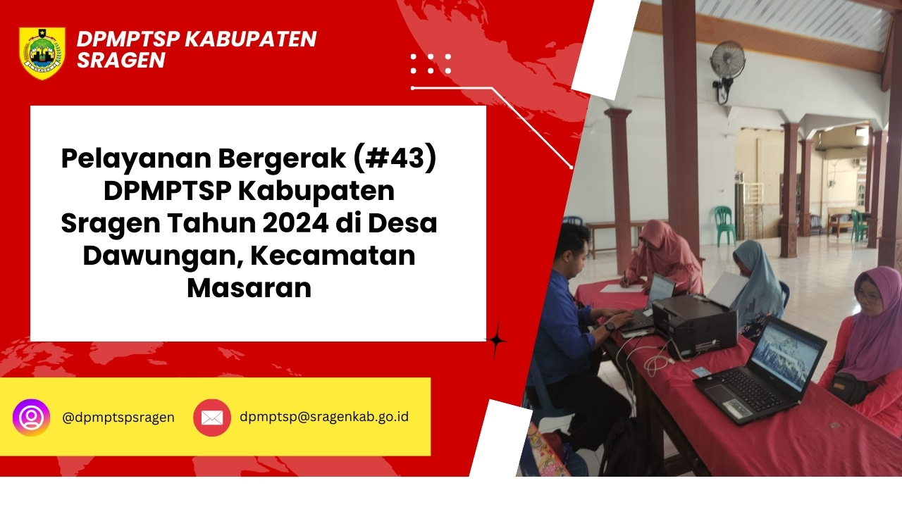Pada Selasa (20/8/2024) Pelayanan Bergerak DPMPTSP Kabupaten Sragen (#43) berada di wilayah Kecamatan Masaran, tepatnya ...
