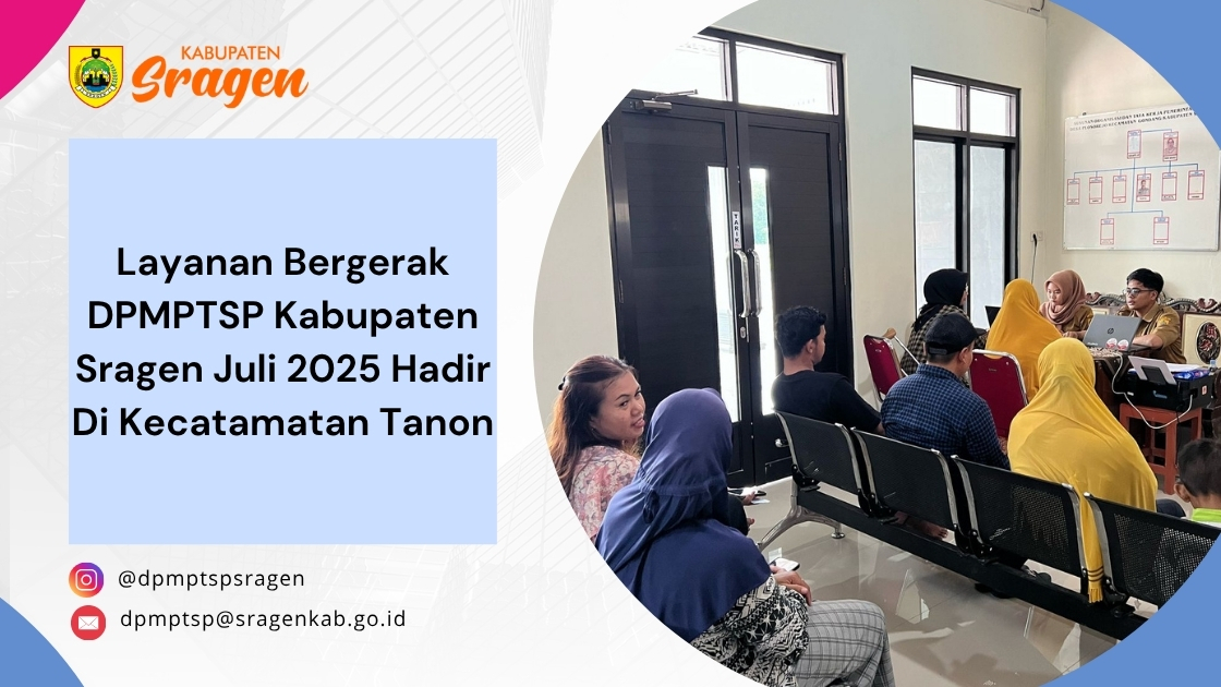 Pelayanan Bergerak DPMPTSP Kabupaten Sragen kembali dilaksanakan di bulan Juli ini, yaitu di wilayah Kecamatan Tanon. Ad...