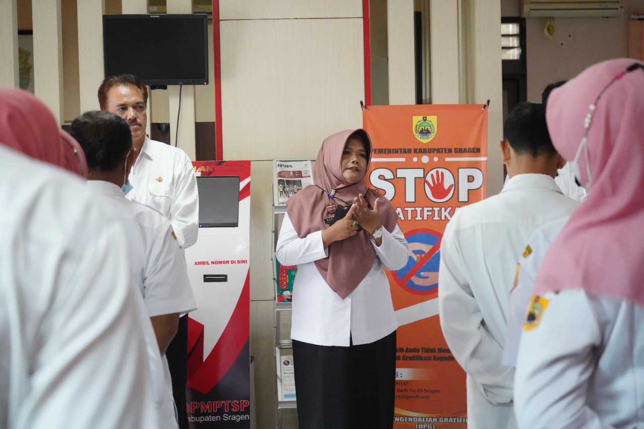 Dalam kegiatan ini dibacakan Kode Etik Pegawai DPMPTSP Kabupaten Sragen, dengan tujuan agar seluruh karyawan dan karyawati DPMPTSP Kabupaten Sragen selalu mengingat dan menerapkan Kode Etik itu dalam melaksanakan tugas melayani masyarakat.
