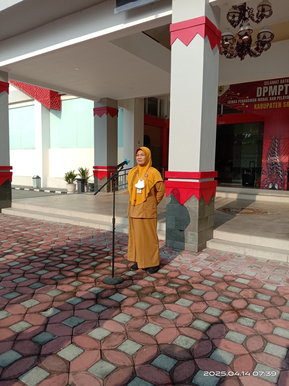 Seluruh ASN dan Non ASN di lingkungan Dinas Penanaman Modal dan Pelayanan Terpadu Satu Pintu Kabupaten Sragen melaksanakan apel rutin Senin pagi di halaman MPP Askara Bumi Sukowati pada Senin (14/04/2025). Apel pagi dipimpin oleh Kasubbag Umum dan Kepegawaian, Ibu Dra. Ekowati Yuli WidyaningsiH, M.Si