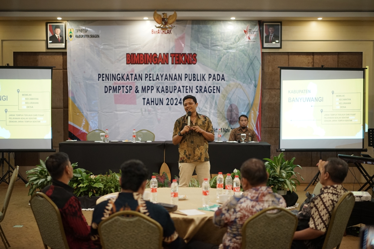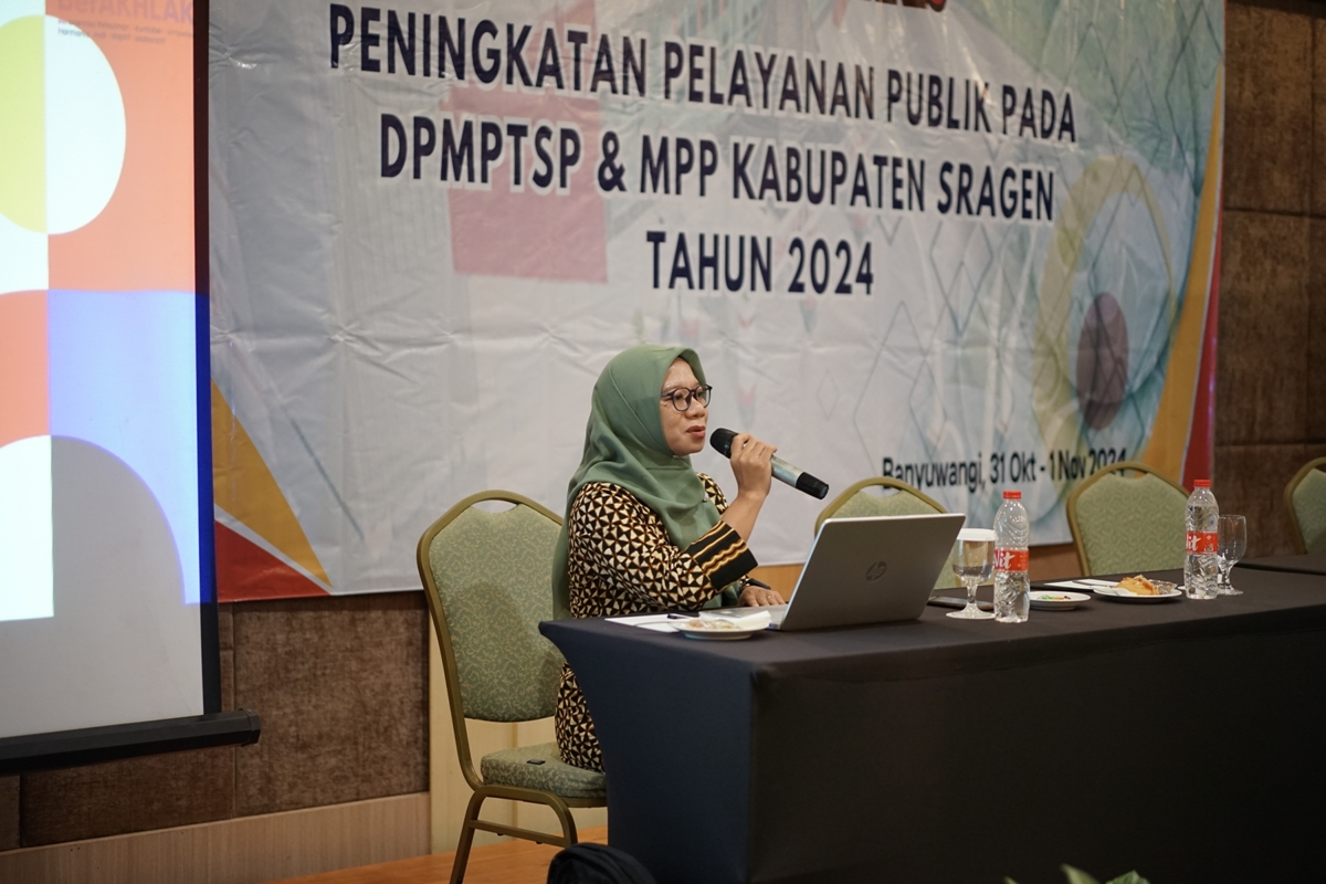 DPMPTSP Kabupaten Sragen kembali menyelenggarakan kegiatan Bimbingan Teknis Peningkatan Kualitas Pelayanan Publik pada DPMPTSP dan MPP Kabupaten Sragen Tahun 2024 pada hari Kamis dan Jumat tanggal 31 Oktober 2024 sampai dengan 1 November 2024 bertempat di Luminor Hotel Banyuwangi. Peserta bimbingan teknis adalah pegawai DPMPTSP Kabupaten Sragen dan perwakilan setiap gerai di MPP Askara Bumi Sukowati Kabupaten Sragen.