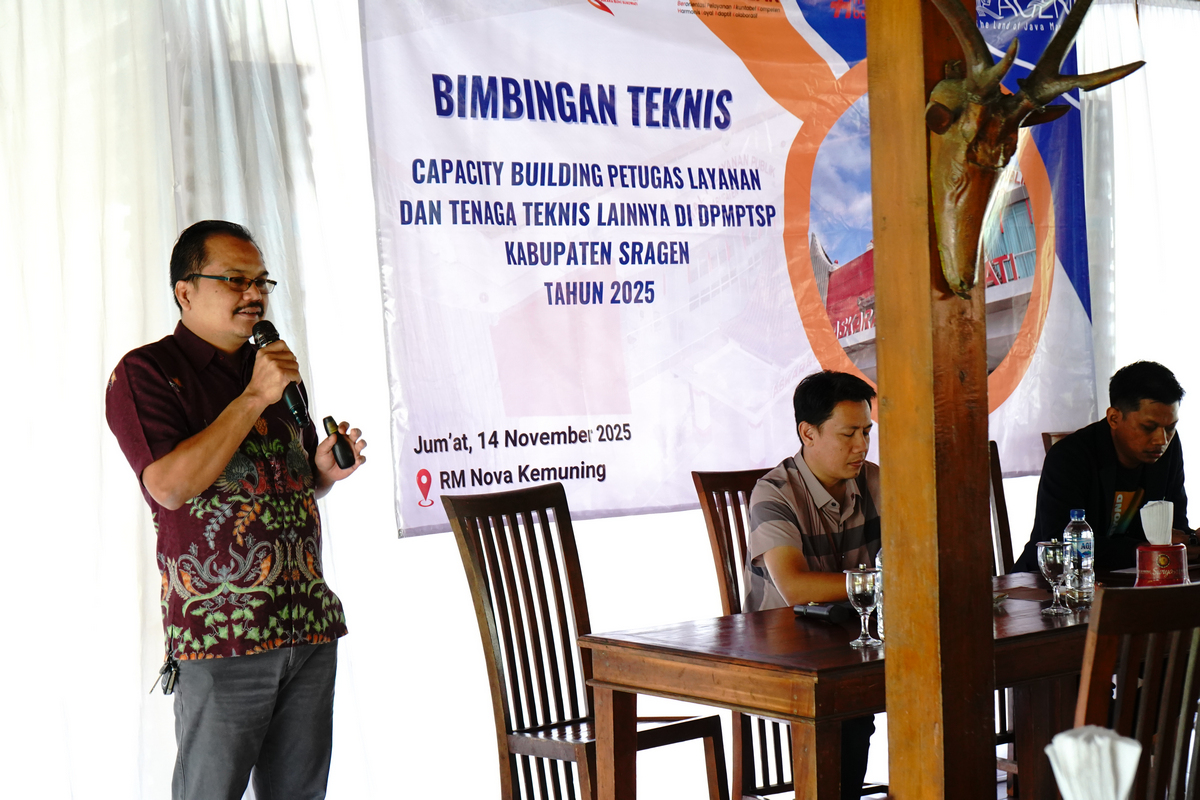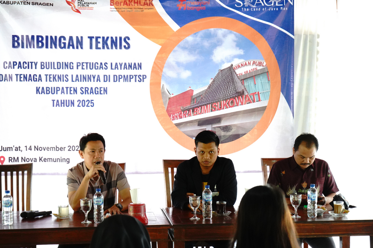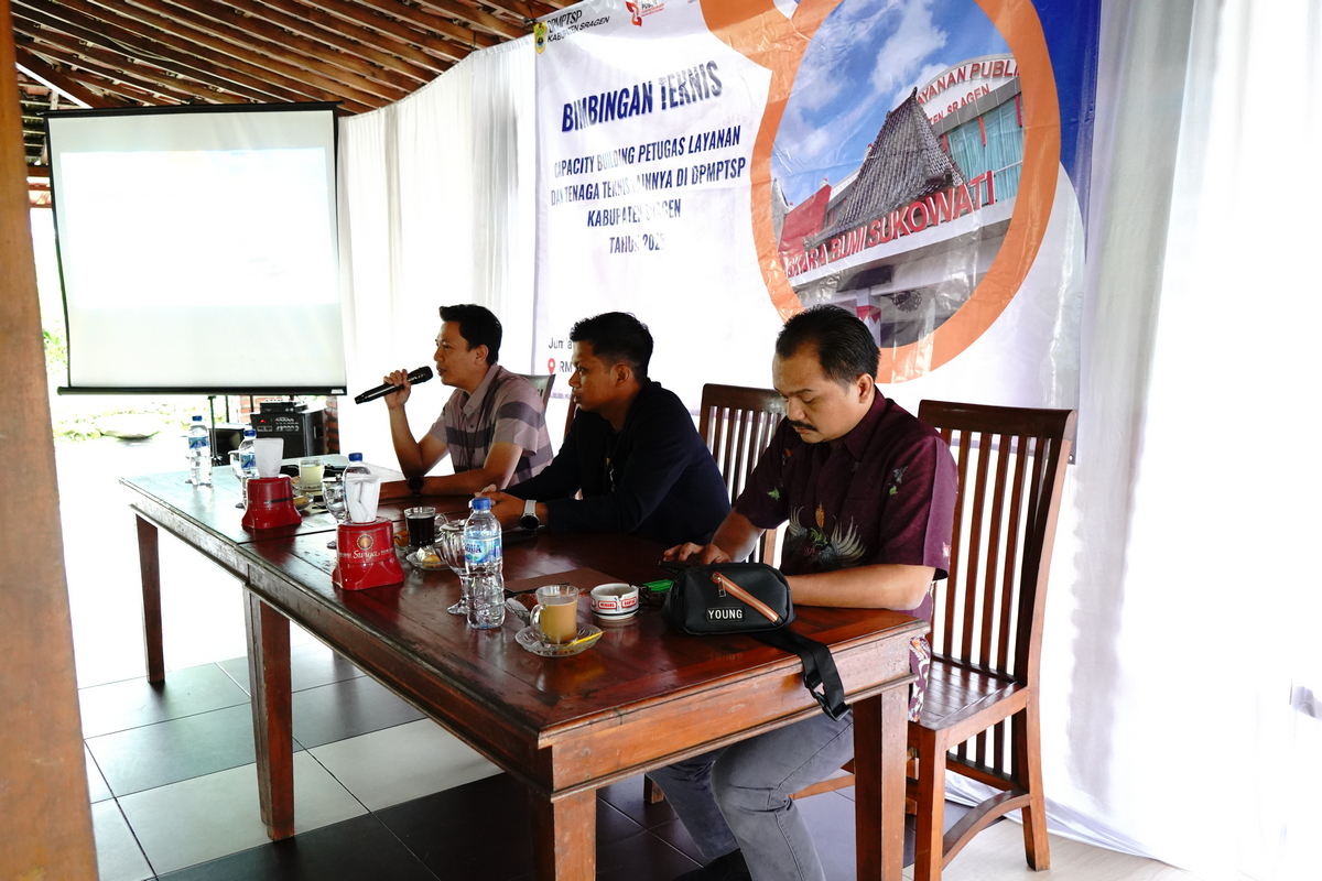 Pada hari Jumat (14/11/2025) DPMPTSP Kabupaten Sragen mengadakan kegiatan Bimbingan Teknis Capacity Building bagi Pegawai di Lingkungan DPMPTSP Kabupaten Sragen Tahun 2025 bertempat di Rumah Makan Nova- Kemuning.