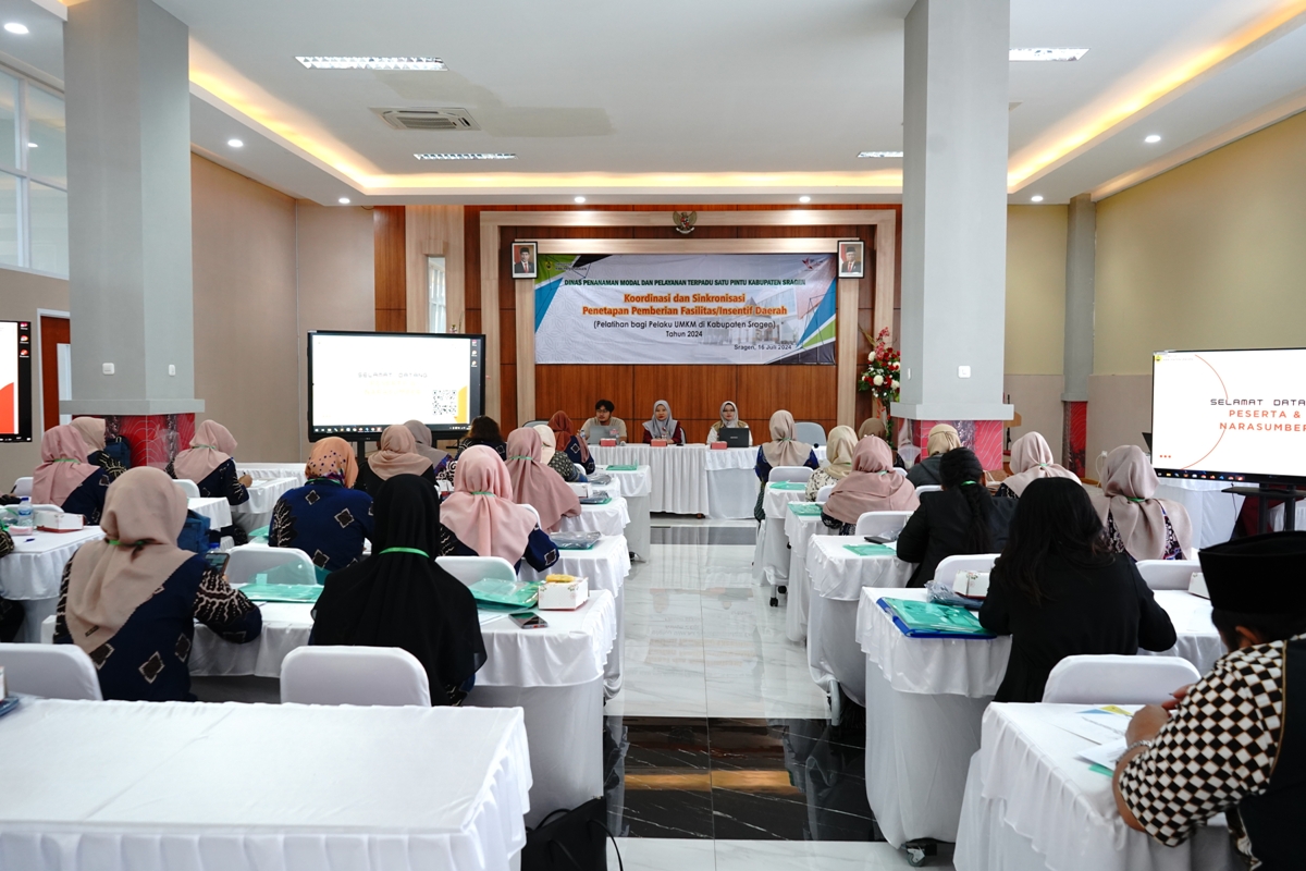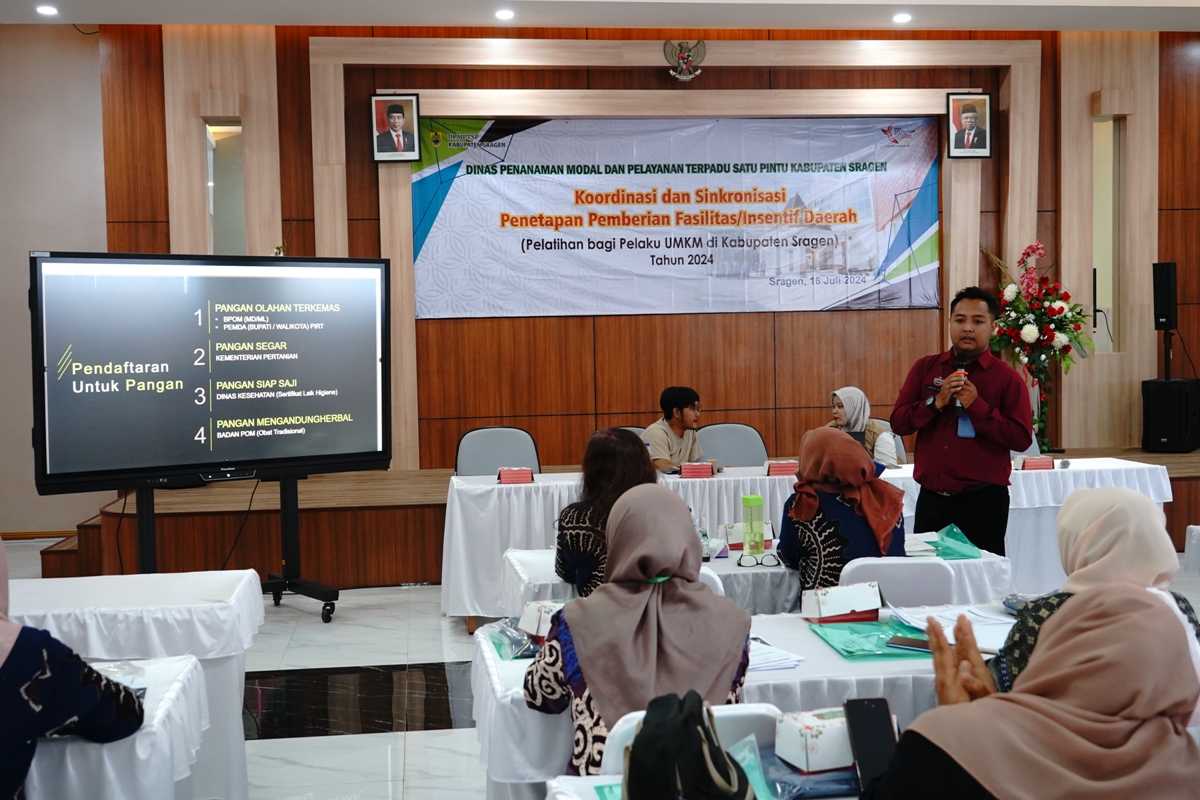 Dinas Penanaman Modal dan Pelayanan Terpadu Satu Pintu Kabupaten Sragen kembali menyelenggarakan Pelatihan Bagi Pelaku UMKM di Kabupaten Sragen pada Selasa (16/07/2024) bertempat di Aula Mal Pelayanan Publik Askara Bumi Sukowati Kabupaten Sragen, dan diikuti oleh 30 (tiga puluh) peserta yang tergabung dalam Paguyuban UMKM “Kharisma” Karangmalang.