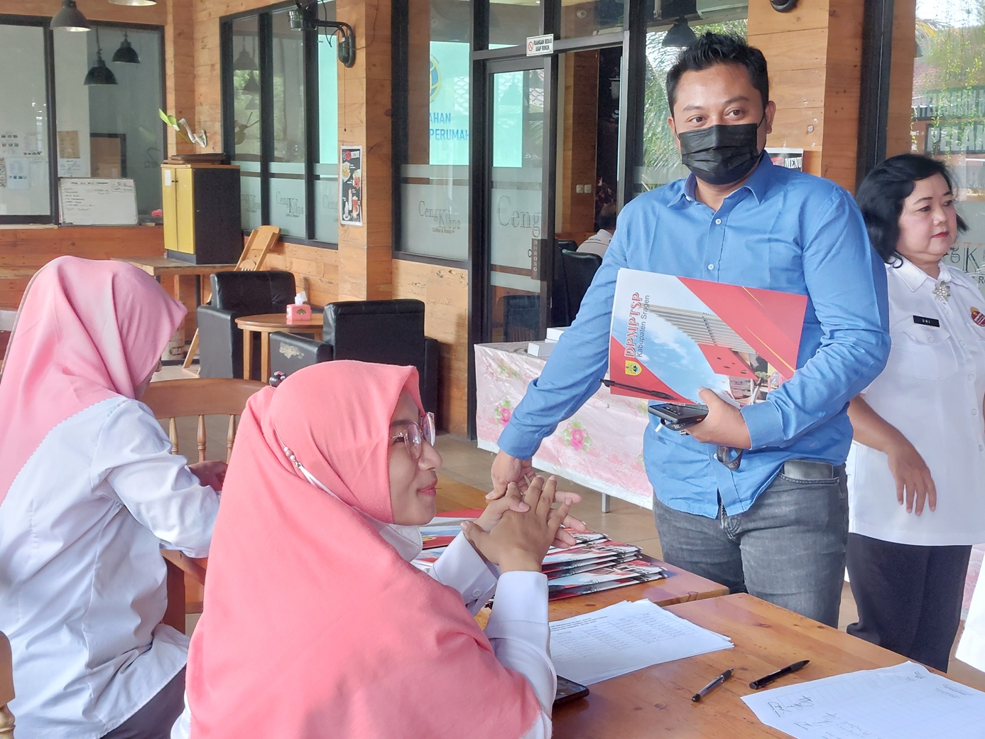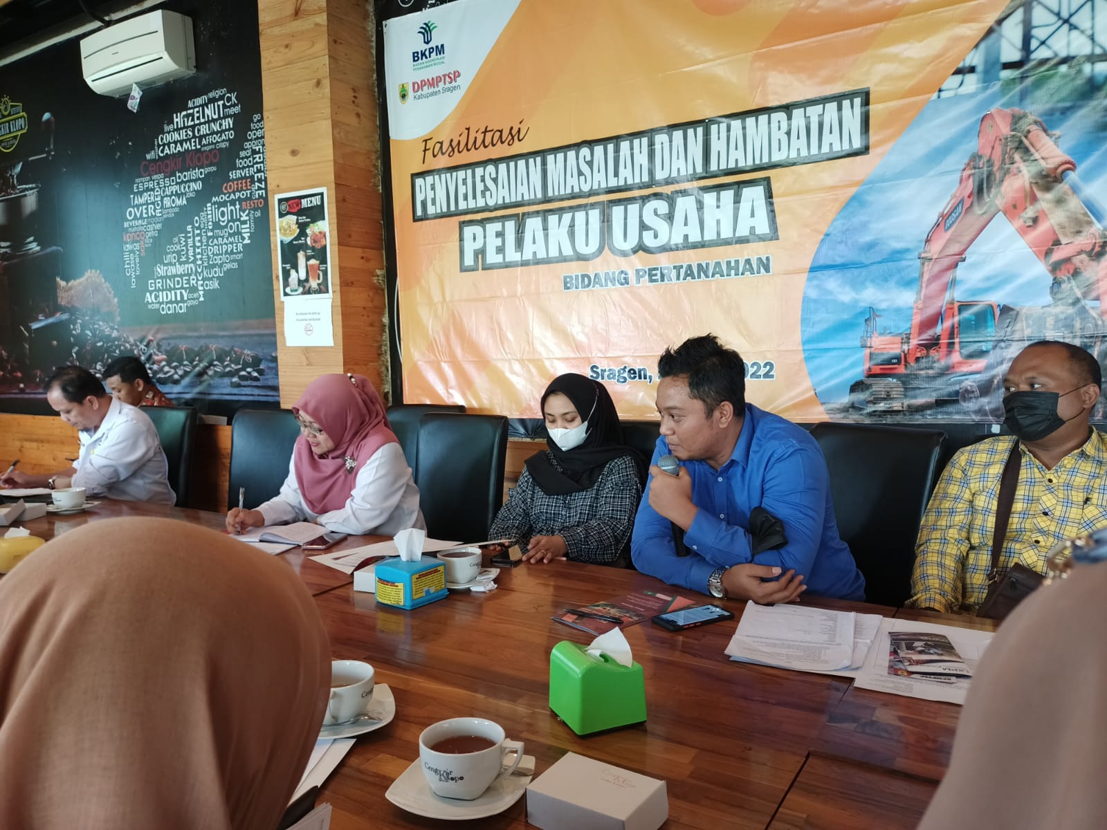 DPMPTSP Kabupaten Sragen mengadakan fasilitasi Penyelesaian Permasalahan dan Hambatan Pelaku Usaha, khususnya bagi pelaku usaha yang mengalami kendala di Bidang Pertanahan dengan mempertemukan para narasumber terkait. Acara diadakan di Cengkir Klopo Coffee and Resto, pada hari Rabu 25 Mei 2022 dengan menghadirkan narasumber dari Kantor Pertanahan Kabupaten Sragen, Bp. JOKO SUHENDRO, A.Ptnh., S.H., M.H, Kepala Seksi Penataan dan Pemberdayaan serta dan Ariyanto, SE, Analis Hukum Ahli Madya DPMPTSP. Harapannya, pertemuan ini bisa memberikan gambaran, informasi dan solusi bagi pelaku usaha yang tengah mengalami kendala masalah pertanahan sehingga kegiatan usahanya bisa segera terealisasi.