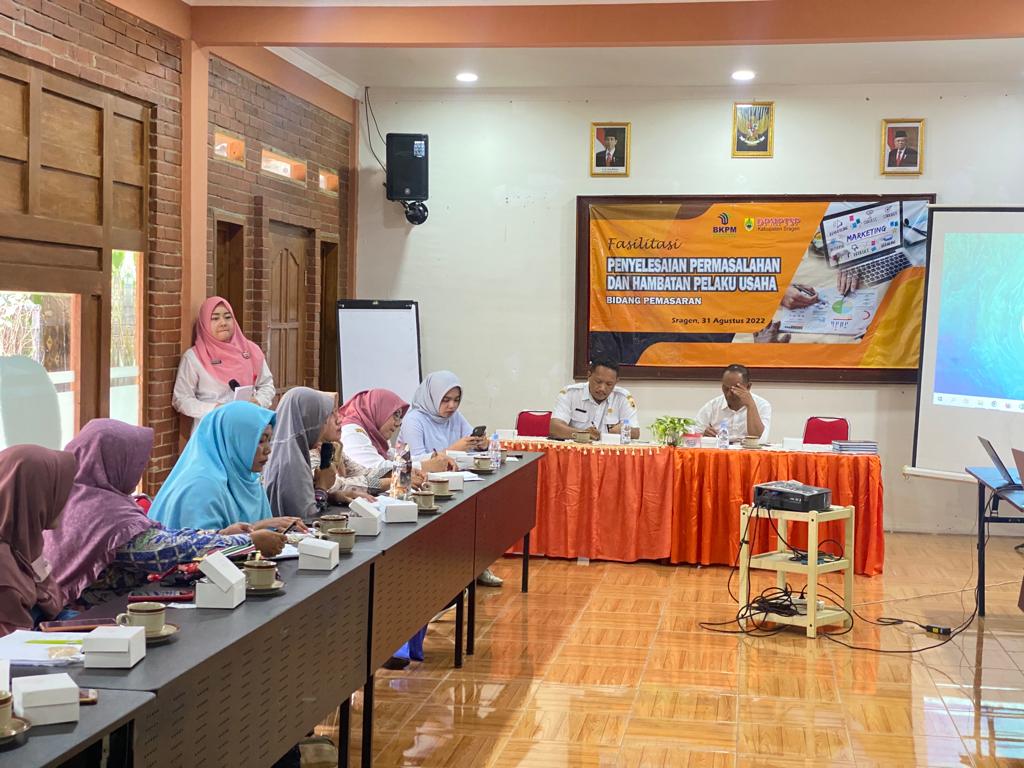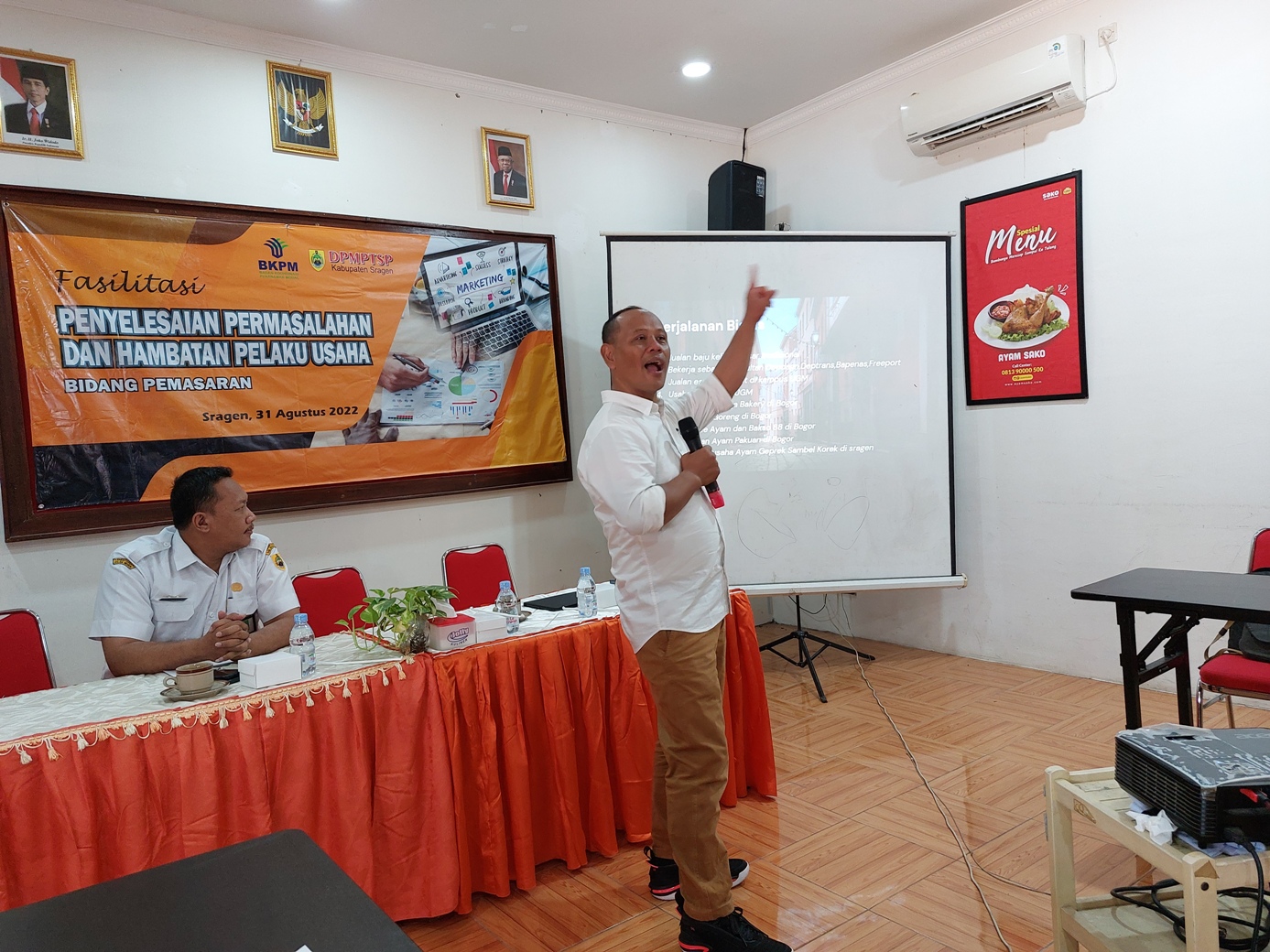 Salah satu kendala yang banyak dialami pelaku usaha adalah kesulitan dalam pemasaran. DPMPTSP Kabupaten Sragen mengadakan fasilitasi Penyelesaian Permasalahan dan Hambatan Pelaku Usaha, khususnya bagi pelaku usaha yang mengalami kendala dalam memasarkan usahanya. Kegiatan dilaksanakan di Resto Ayam Geprek SAKO Cantel – Sragen pada hari Rabu 31 Agustus dengan peserta pelaku usaha dari berbagai sektor. Menghadirkan narasumber yang ahli dalam bidang marketing sekaligus pelaku usaha langsung, yakni Bp. Ir. Kusnadi Ikhwani, Komisaris PT. Geprek Group Indonesia dengan materi “Marketing Langit” serta Bp. Okho Eko Wibowo, S.STP, direktur PT. Pradana Mandiri Dinaco (Pradana Sport) dengan materi “Pemasaran via Online.” Kegiatan ini dimaksudkan untuk memberikan gambaran, informasi, tips, trik pemasaran sehingga menjadi solusi bagi pelaku usaha yang tengah mengalami kendala dalam pemasaran.