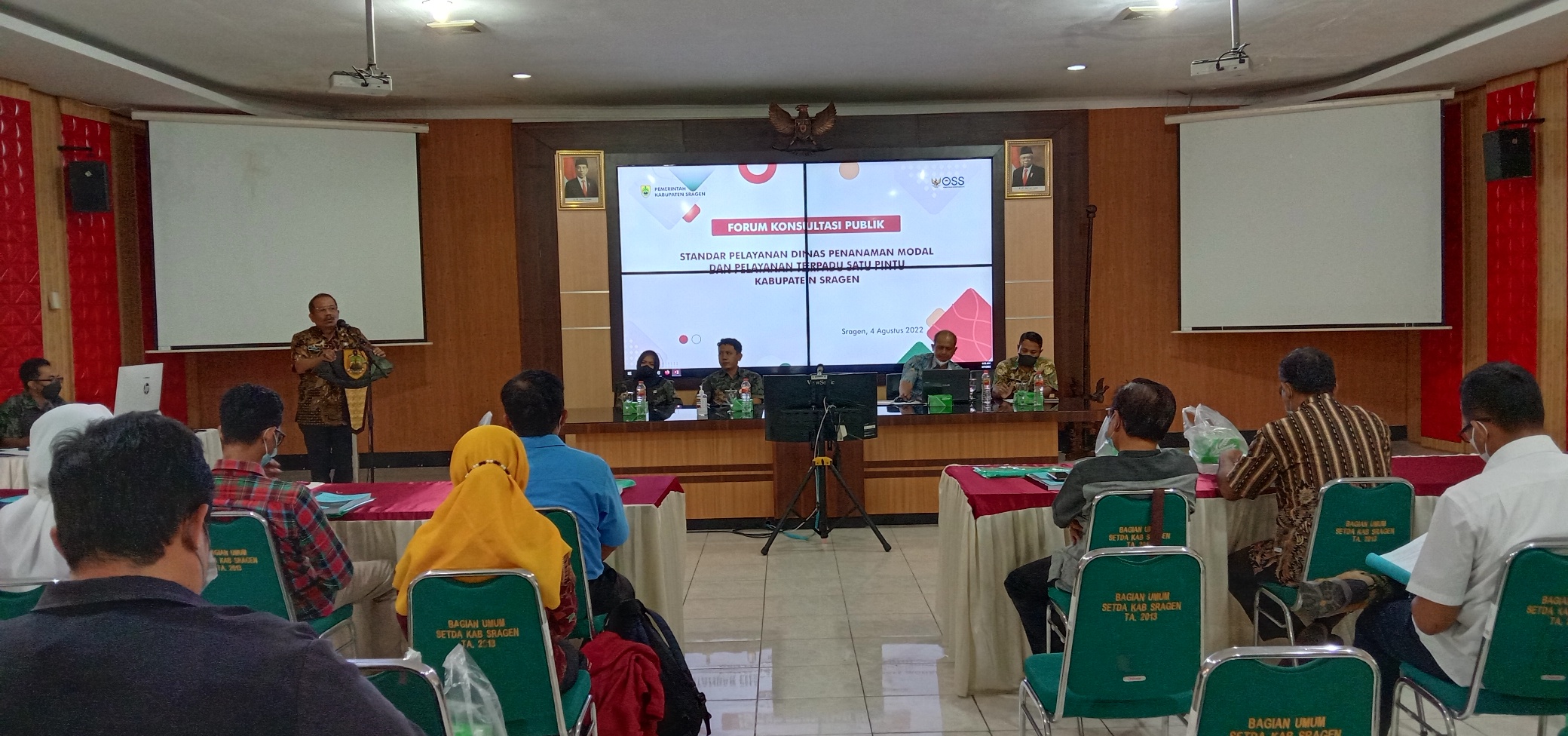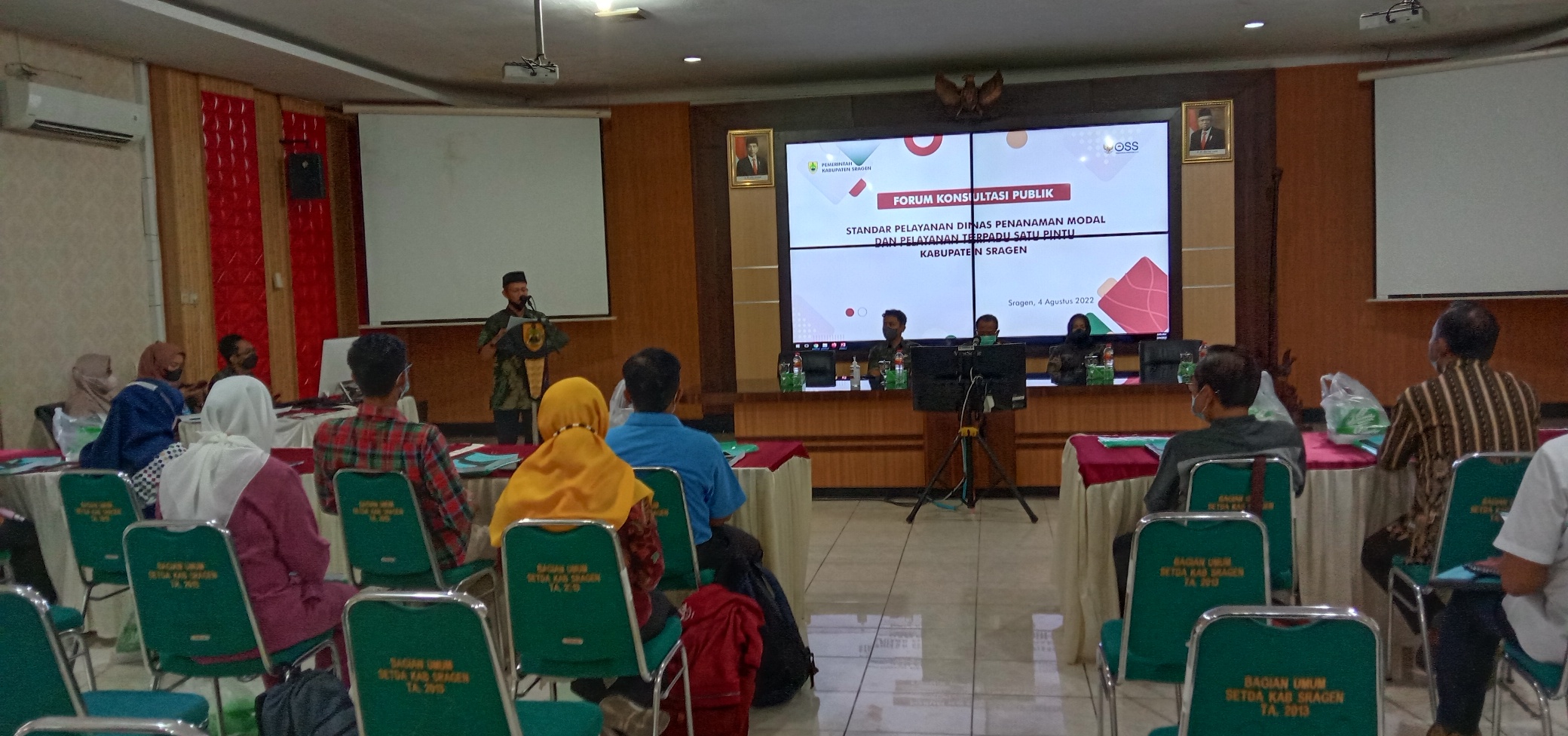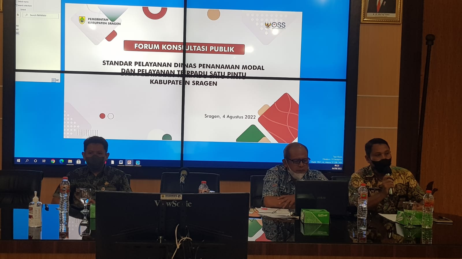 DPMPTSP Kabupaten Sragen telah melaksanakan Forum Konsultasi Publik terkait Standar Pelayanan Perizinan dan Nonperizinan DPMPTSP pada hari Kamis, 4 Agustus 2022 bertempat di Aula Sukowati Setda Kabupaten Sragen.
