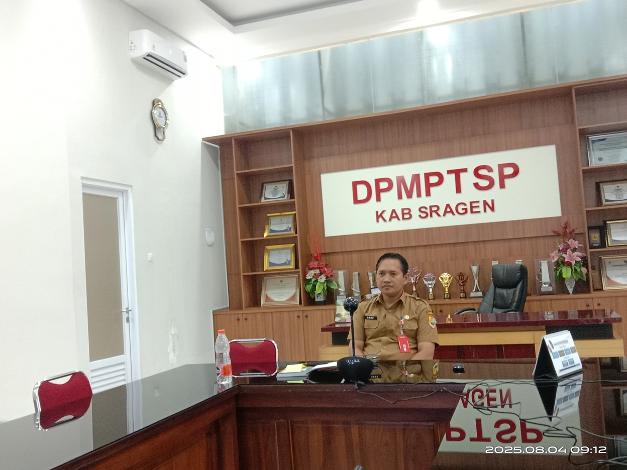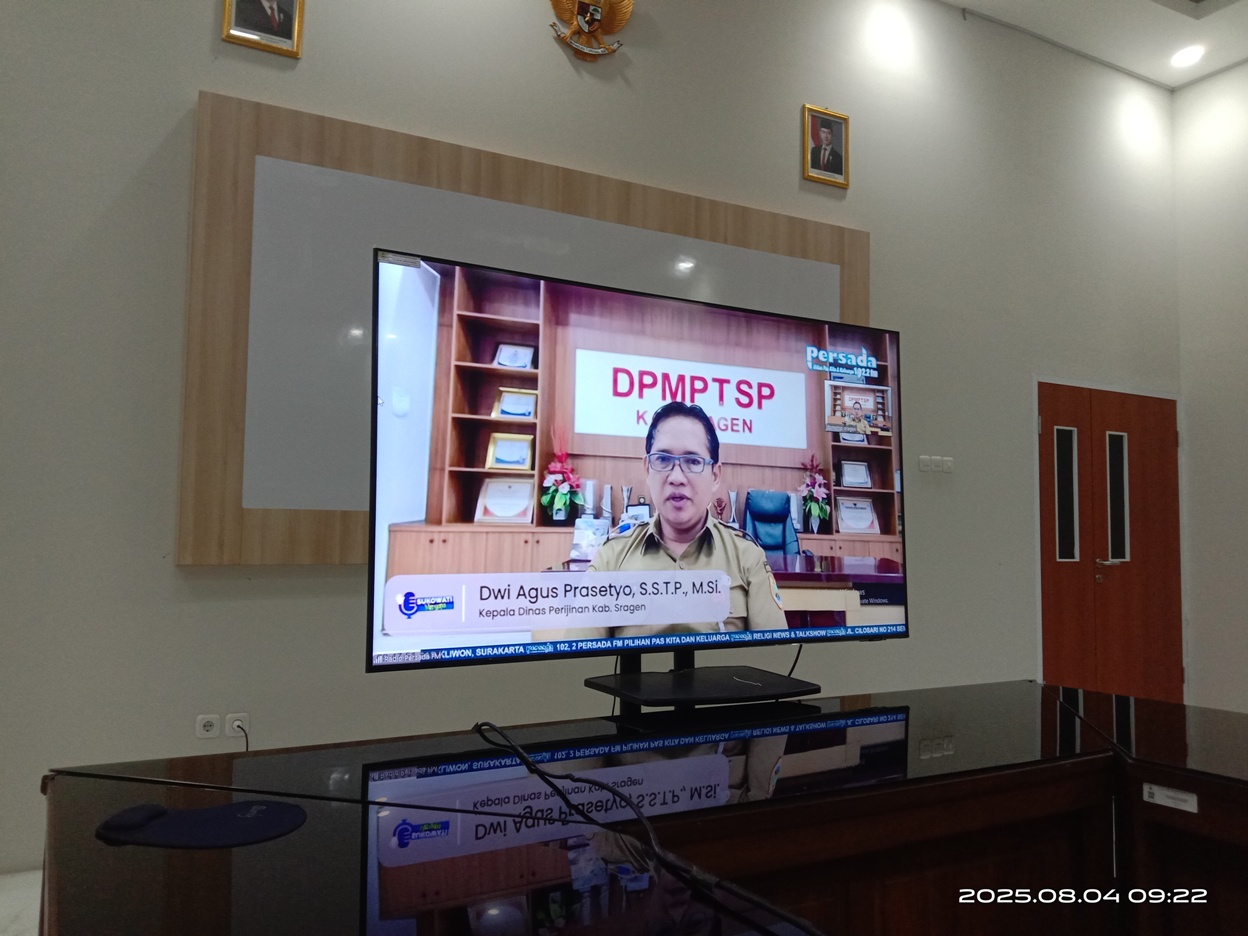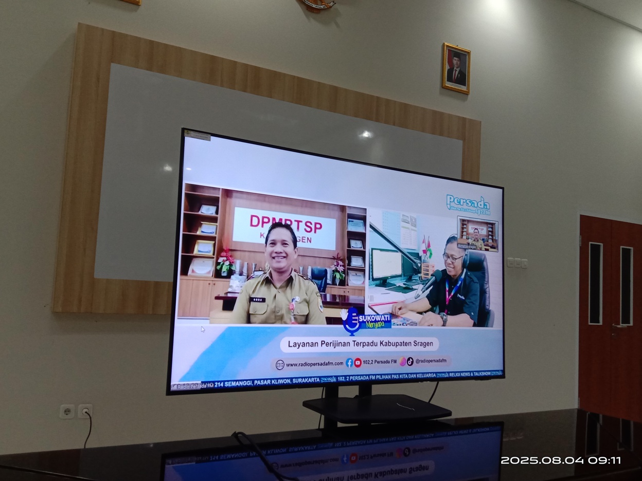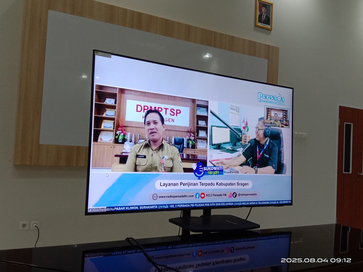 Pada hari ini Senin (4/8/2025), Kepala DPMPTSP Kabupaten Sragen (Bapak Dwi Agus Prasetyo, S.STP, M.Si) mengisi acara live radio “Sukowati Menyapa” melalui zoom meeting. Program “Sukowati Menyapa” ini merupakan program acara rutin dari Radio 102,2 Persada FM yang diselenggarakan setiap Senin pertama tiap bulannya, pukul 09.00 WIB sampai dengan 10.00 WIB.