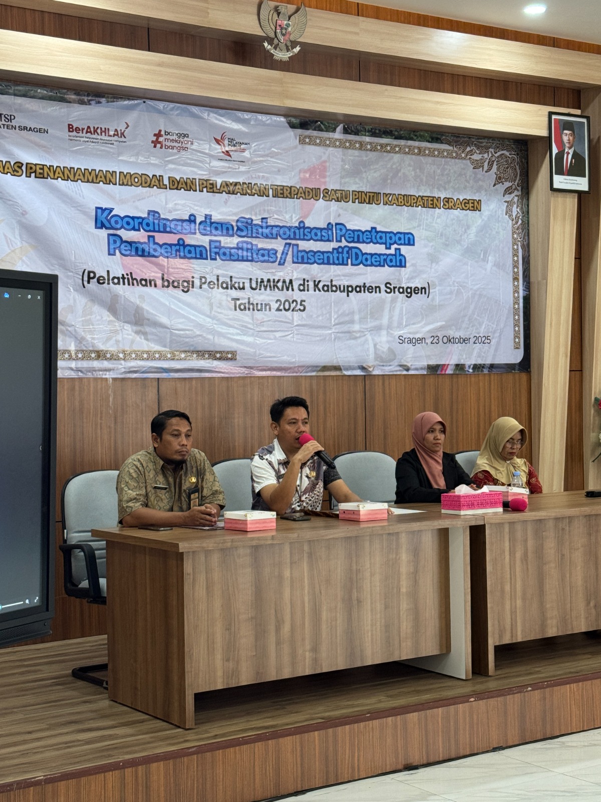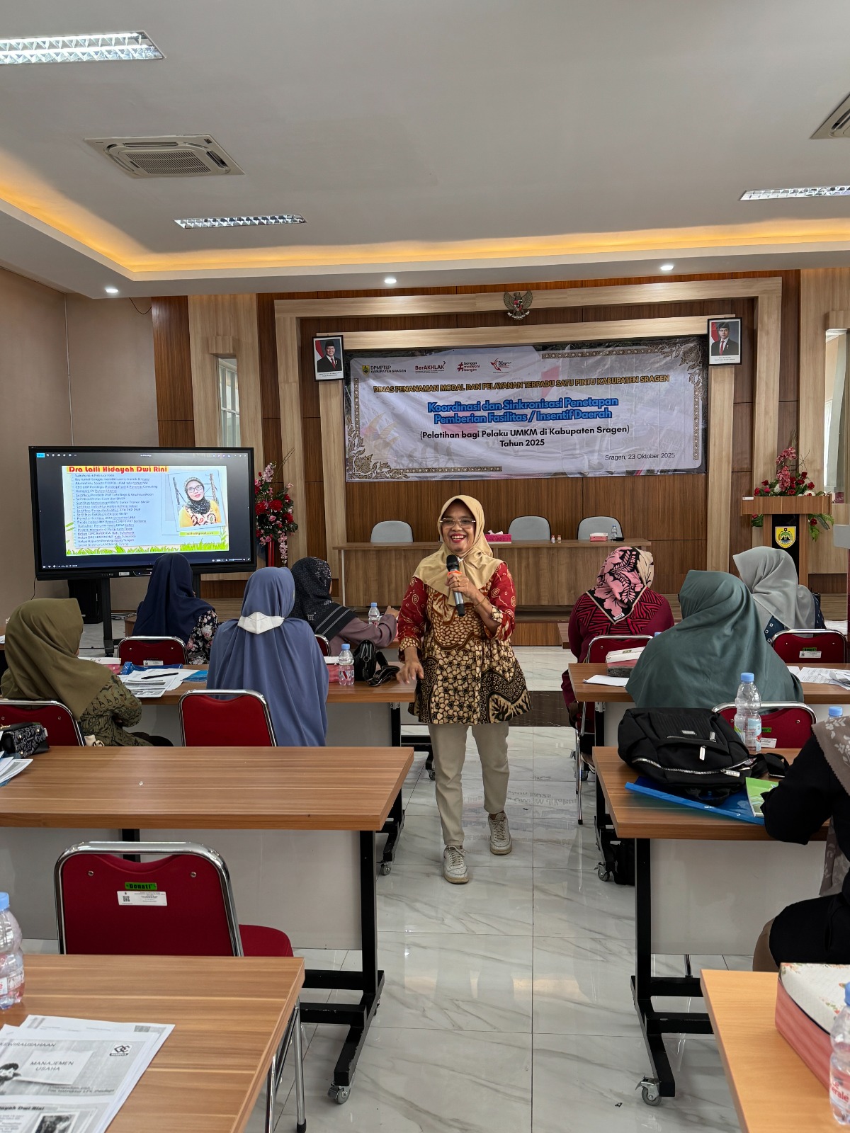 Dinas Penanaman Modal dan Pelayanan Terpadu Satu Pintu (DPMPTSP) Kabupaten Sragen kembali melaksanakan Kegiatan Koordinasi dan Sinkronisasi Penetapan Pemberian Fasilitas/Insentif Daerah bagi UMKM berupa Pelatihan Bagi Pelaku UMKM di Kabupaten Sragen Tahun 2025, bertempat di Aula MPP Askara Bumi Sukowati Kabupaten Sragen pada Kamis (23/10/2025). Pelatihan hari ini adalah pelatihan terakhir yang dilaksanakan pada tahun 2025.