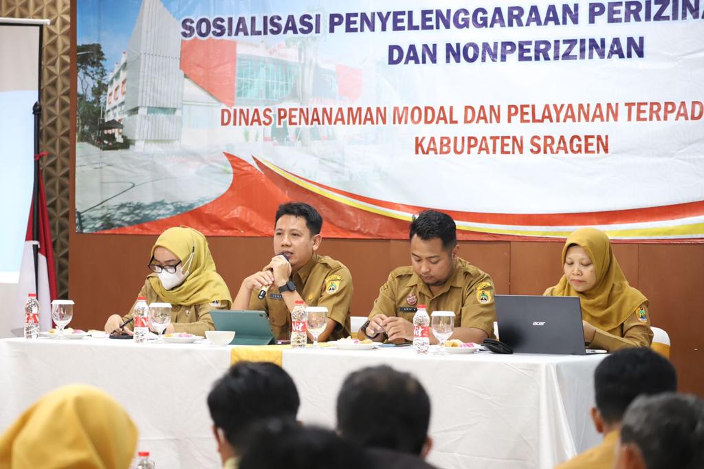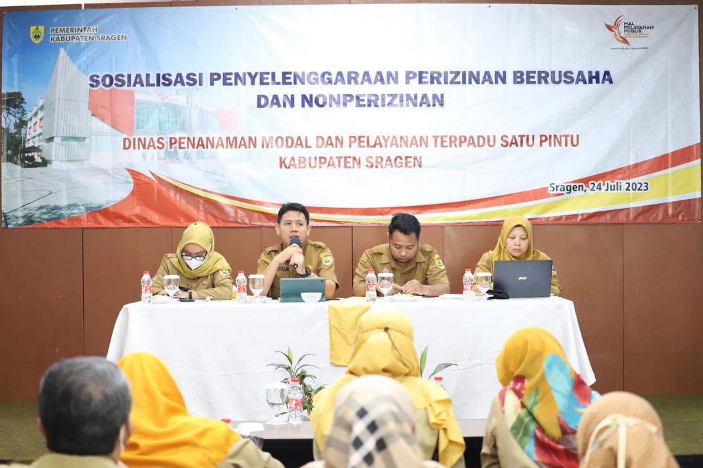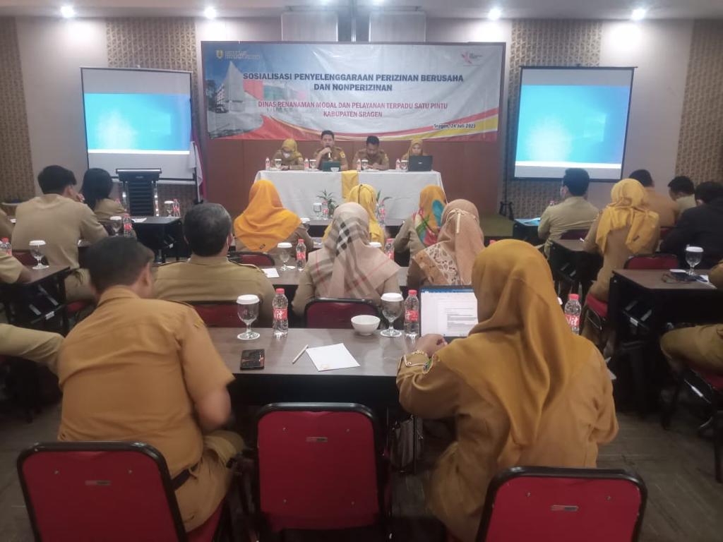 Dalam rangka mendukung penyelenggaraan perizinan berusaha di daerah yang cepat, mudah, efektif dan efisien serta dalam upaya mendekatkan keterjangkauan pelayanan berusaha, Dinas Penanaman Modal dan Pelayanan Terpadu Satu Pintu (DPMPTSP) Kabupaten Sragen menyelenggarakan Kegiatan Sosialisasi Penyelenggaraan Perizinan Berusaha dan Nonberusaha, bertempat Front One Hotel Sragen pada Senin (24/07/2023). Adapun pesertanya adalah perwakilan petugas dari Kecamatan Karangmalang, Kecamatan Miri, Kecamatan Jenar, desa-desa di wilayah Kecamatan Karangmalang, Miri dan Jenar.
