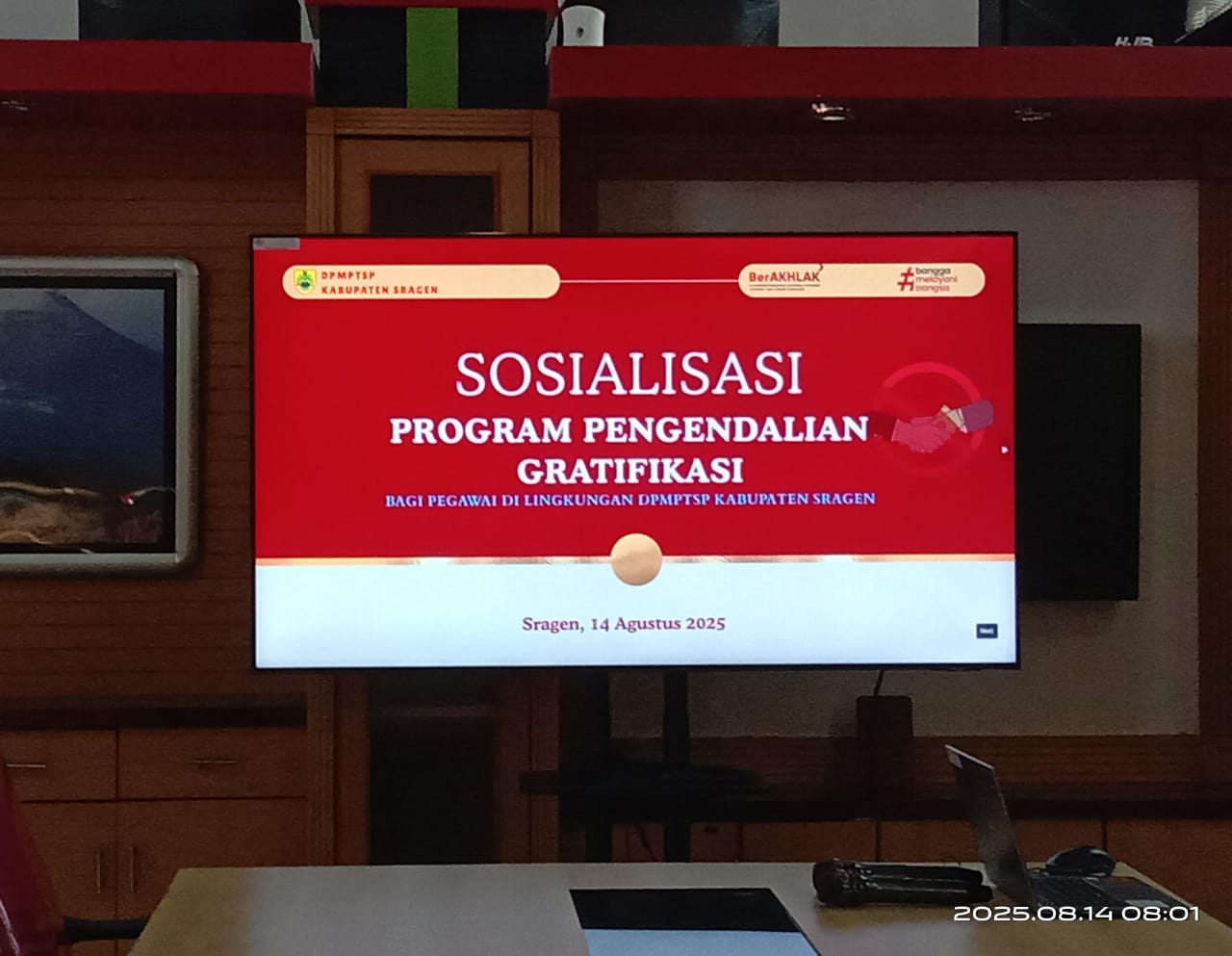 Pada Kamis (14/08/2025) DPMPTSP Kabupaten Sragen melaksanakan kegiatan Sosialisasi Program Pengendalian Gratifikasi, bertempat di Ruang OSS Lounge, komplek MPP Kabupaten Sragen.
